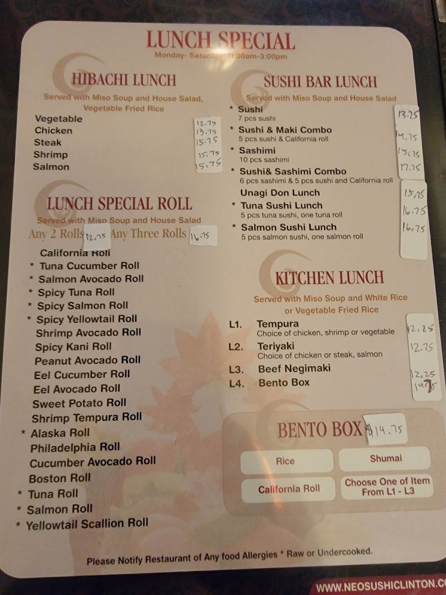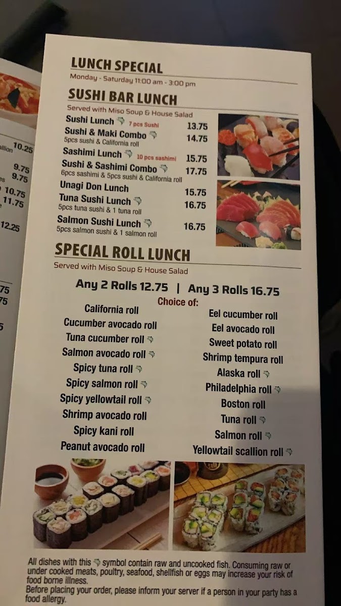 Served with miso soup and house salad. Served seven pieces of sushi and tuna roll or California roll. Consuming raw or undercooked meat, poultry, seafood, shellfish or eggs may increase your risk of foodborne illness, especially if you have certain medical conditions.